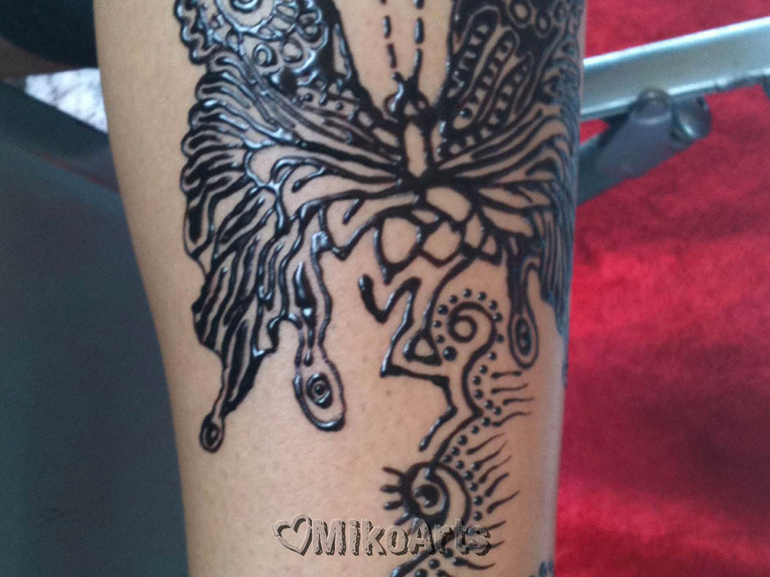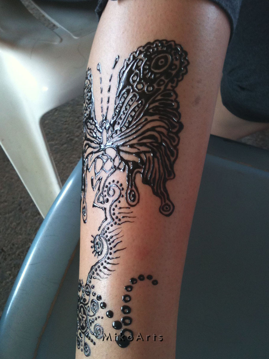 Atomic Butterfly is a Henna artwork I painted on the leg of a visitor at the Carnuel Fiesta in New Mexico. They wanted a completely custom tattoo of a butterfly, but they asked for something unique, something that represented a positive and bright future.