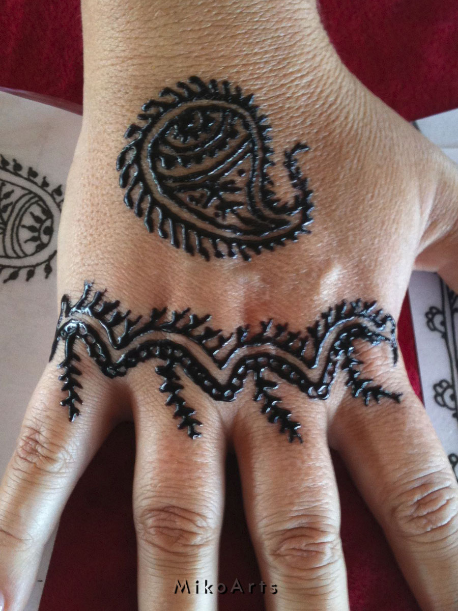 Cellular Sojourn is a Custom Organic Henna Tattoo Miko I painted on the hand of a patron at the Carneul Festival in New Mexico. The recipient wanted a design that 'just made them happy every time they looked at the time.'I thought it would be nice to make them a finger bracelet (a Henna Bracelet is a pattern or design that is intended to wrap around a body part), and float the Zoroastrian-based paisley design reminiscent of Life and Eternity.