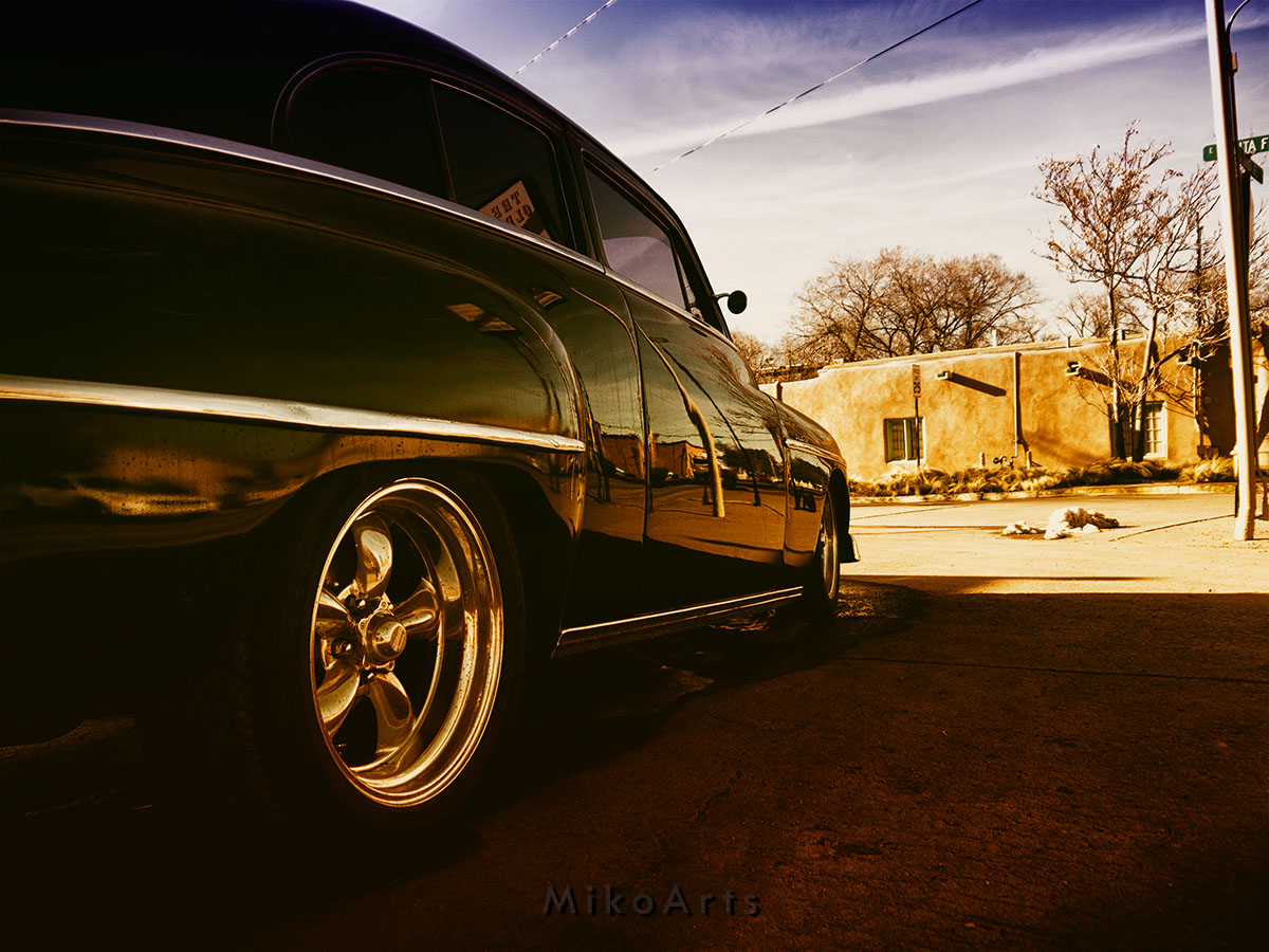 I really love old vehicles, they beckon with such creative majesty mixed with engineering. Something I feel especially lucky to have captured in this photo are the sloping power lines and other street signs that follow the De Lux's sensual curves, backward into a dark and dreamy space. And then how that all contrasts such darkness, in the middle of the day, to explode into the bright Southwest colors of adobe and sky.