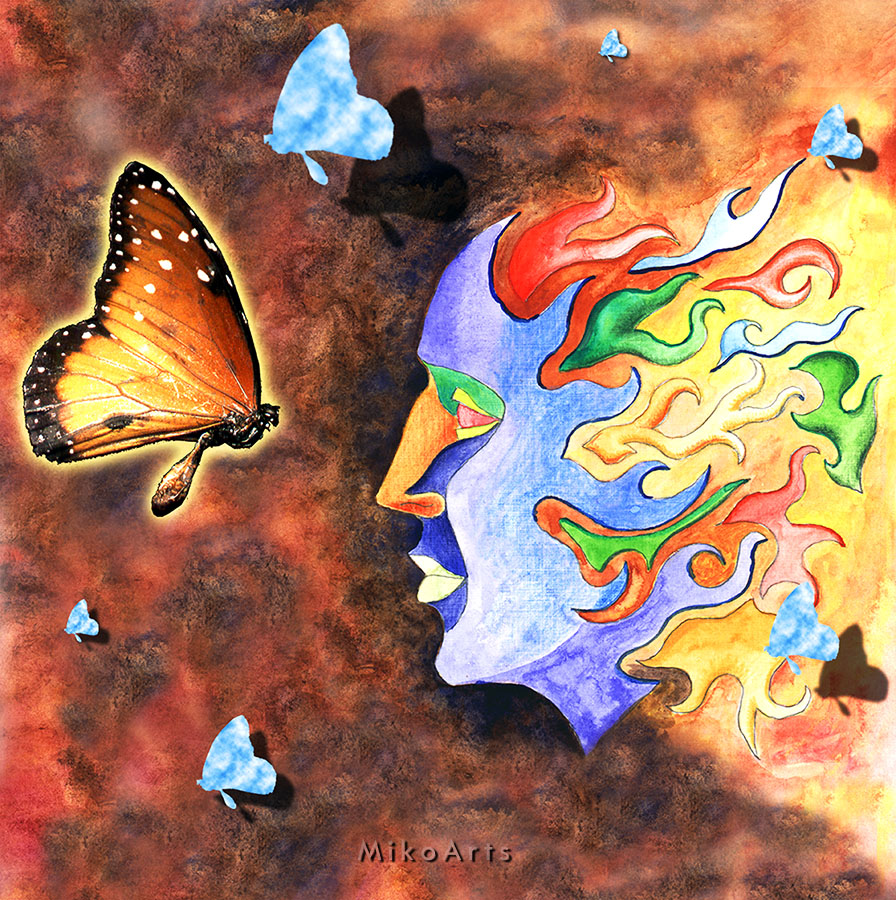 I painted the face and the background with the flames, with Windsor Newton watercolors, and scanned the butterfly with my Epson scanner. The final composition I did in a completely digital environment, to blend the poetic qualities of the person and the creature, and mirror the semblences of butterflies throughout the space.