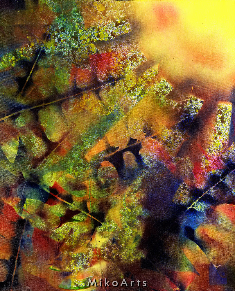 This painting was my first alla prima with spray paint, dancing with the emotions I experienced one particular Southwest morning walking out and feeling the Southwest sun upon my skin. This painting still brings me back to that Fall morning, with light fracturing through the prismatic Bosque leaves, enlivening the start to my day.