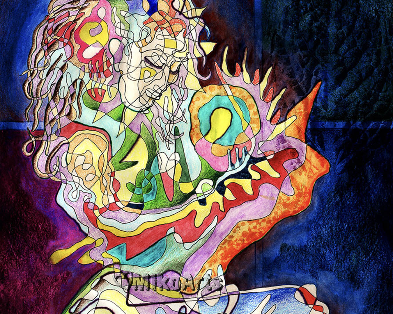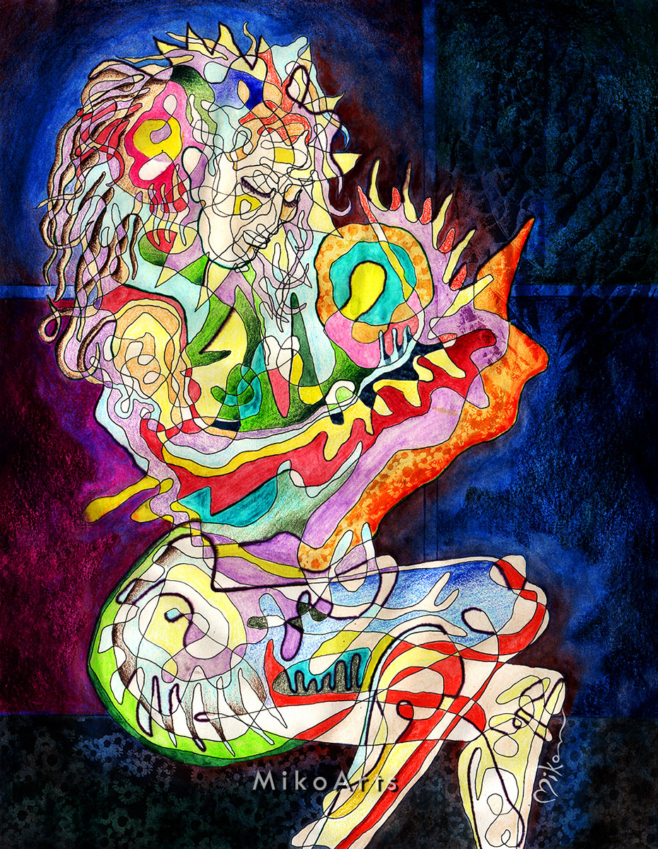 I used my illustration Micron pens to do the one-continous line first. This piece I did all at once, without any studies of it, on Strathmore 80 weight. I just happened that the first-go turned out to be exactly what I felt was befitting the subject, with the one-line playfully at moments yet fiercely at others, depicting the shape of a woman and her child. I used my set travel-tray set of Windsor Newton watercolors to finish with the main colors, and then my Derwent water-soluble pencil colors to complete the painting.