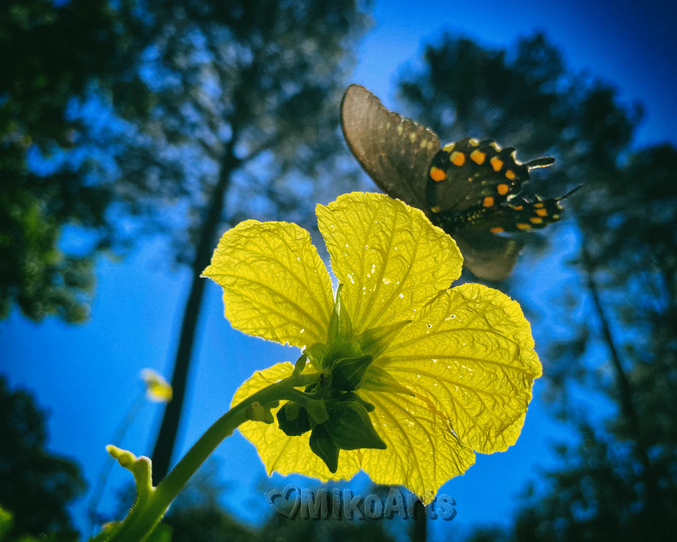 Walking about the garden to water and train some Loofah vines, I noticed this butterfly checking out the spread of bright blossoming flowers excitedly drinking from the sun's abundant light. For just a few seconds, it all but checked out, landed, and then departed, a little loofah flower who got to be its solace for just a Summer's second...