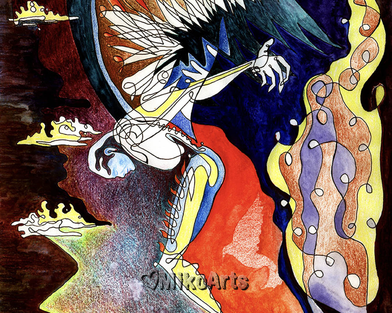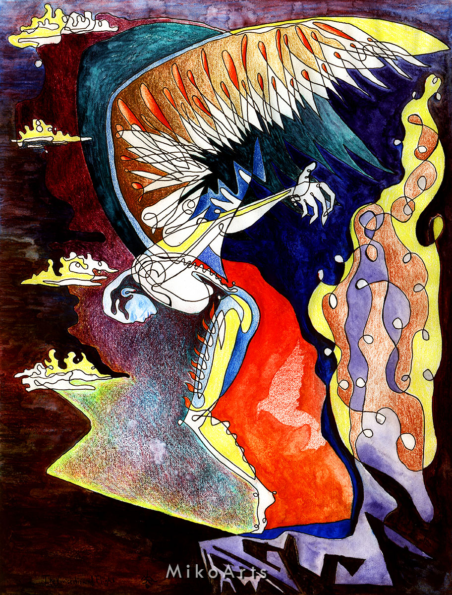 With wings one finds themselves over a rocky precipice, between the expanse of ever-falling sky, and a ground which gives them temporary rest. A line of ink reveals the mysteries, encrypted in color, which lift the willing, into Destiny's reach...