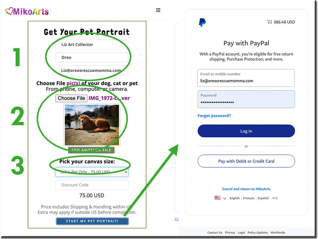 Just go to my "Get Your Pet Portrait Link" at the very top on on my home page if you want to quickly order a 5x7 Pet Painting or a 9x12 Pet Painting, all done on canvas and they come with 5 coloring pages for you your friends and family.